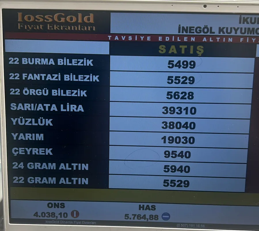 Son üç yıldaki fiyat performansı, altının hâlâ kriz dönemlerinin en güvenli yatırım aracı olduğunu bir kez daha kanıtladı. Doların zayıfladığı, enflasyonun yüksek seyrettiği bir ekonomik ortamda altına yatırım yapanlar bir kez daha kazanan taraf oldu. Bugün başta İstanbul Kapalıçarşı olmak üzere bir çok ilde altın satışlarının geçici olarak durduğu bilgileri kamuoyunda konuşulurken İnegöl'de kuyumcular satışın devam ettiğini ve her hangi bir sorun olmadığı açıklandı. İşte İnegöl2de anlık altın fiyatları.