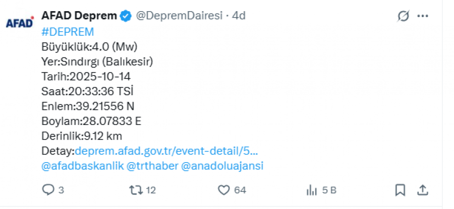 Balıkesir Sındırgı'da saat 20.33'te 4.0 büyüklüğünde bir deprem meydana geldi.