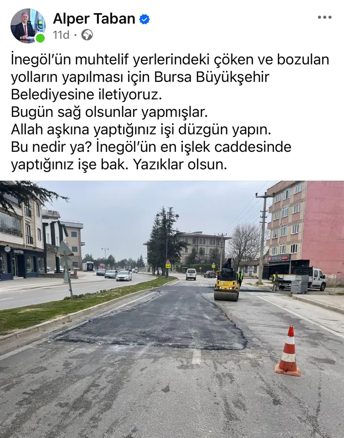 “İnegöl’ün muhtelif yerlerindeki çöken ve bozulan yolların yapılması için Bursa Büyükşehir Belediyesine iletiyoruz. Bugün sağ olsunlar yapmışlar. Allah aşkına yaptığınız işi düzgün yapın.”