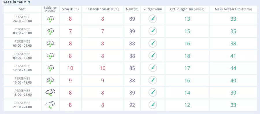 Nem oranı %84-89 arasında, rüzgar saatte yaklaşık 17 km hızında esecek.