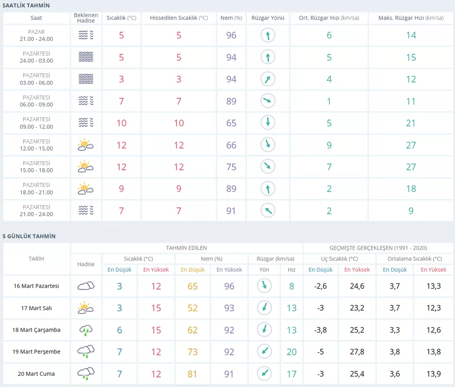 Öğleden sonra 15.00-18.00 saatleri arasında sıcaklık yine 12 derece civarında kalacak. Akşam saatlerine doğru sıcaklık yeniden düşerek 9 dereceye inecek. Gece saatlerinde ise sisin yeniden etkili olması ve sıcaklığın 7 derece civarında seyretmesi bekleniyor. Rüzgarın gün boyunca genellikle hafif eseceği tahmin ediliyor.