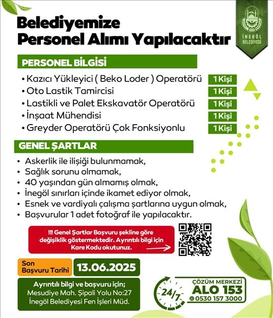 İnegöl Belediyesi'nden yapılan açıklamada, ilçe halkına daha kaliteli ve etkin hizmet sunabilmek amacıyla yapılacak personel alımına ilişkin şu ifadelere yer verildi: “Kurumumuz bünyesinde istihdam edilmek üzere 5 ayrı alanda görevlendirilecek toplam 5 personel alımı gerçekleştirilecektir. Bu kapsamda; Kazıcı Yükleyici (Beko Loder) Operatörü, Oto Lastik Tamircisi, Lastikli ve Palet Ekskavatör Operatörü, İnşaat Mühendisi, Greyder Operatörü (Çok Fonksiyonlu) unvanlarında personel istihdam edilecektir.”