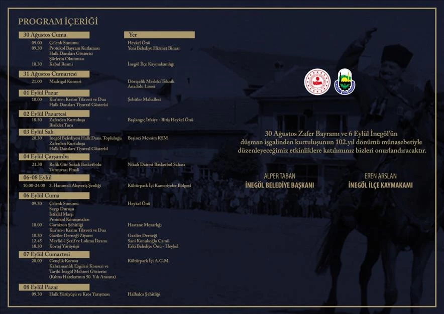 “06 Eylül Cuma, İnegöl’ümüzün düşman işgalinden kurtuluşunun 102. Yılı. Cuma günü yine sabah 09.30’da Atatürk Anıtında çelenk sunumuyla resmi törenler başlayacak. 10.00’da Garnizon Şehitliğinde kuranı kerimler okunup dualar edilecek, 10.30’da Gaziler Derneğimizi ziyaret edeceğiz. 12.45’te de Sani Konukoğlu Camimizde mevlit ve Cuma namazı sonrası lokma ikramlarımız olacak. Beraberinde 18.30’da Sani Konukoğlu Camisinden Atatürk Anıtına kadar bir kortej yürüyüşü gerçekleştireceğiz. Burada da heykel önünde halk dansları gösterileri olacak.”