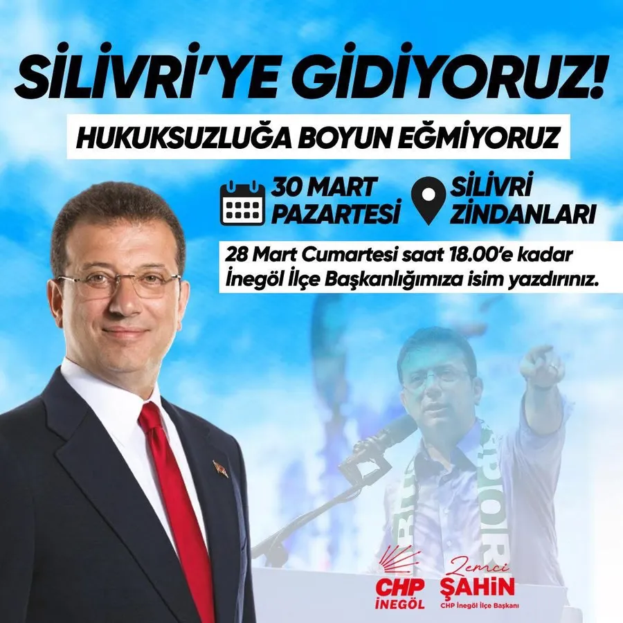 30 Mart Pazartesi günü Silivri Cezaevi önünde düzenlenecek buluşmaya katılmak isteyen vatandaşların, isimlerini en geç 28 Mart Cumartesi günü saat 18.00’e kadar CHP İnegöl İlçe Başkanlığı’na yazdırmaları gerektiği bildirildi.