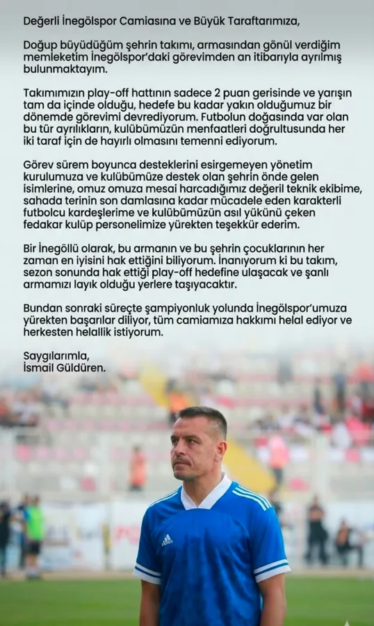 “Doğup büyüdüğüm şehrin takımı, armasına gönül verdiğim memleketim İnegölspor’daki görevimden ayrılmış bulunmaktayım.”
