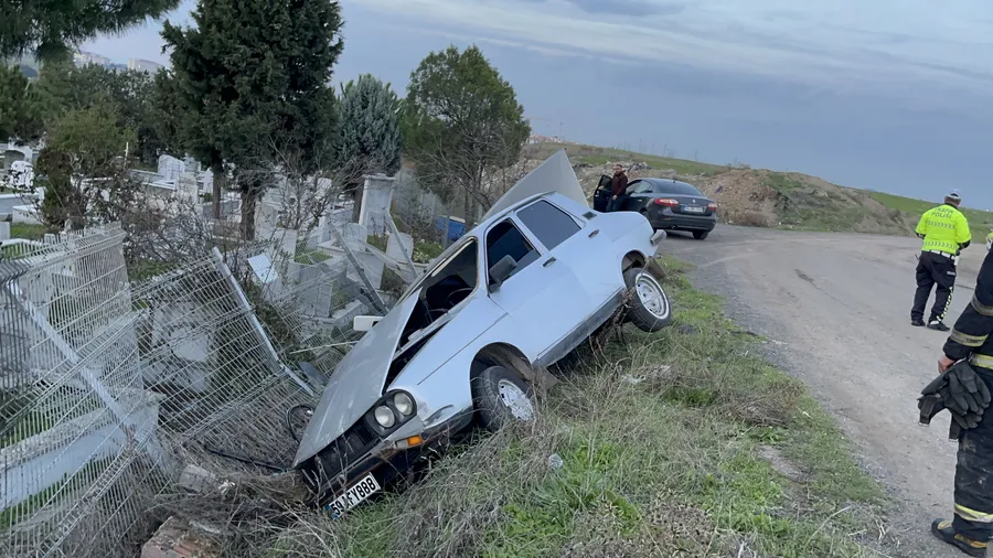 Yoldan çıkan bir otomobil, yeni mezarlığa daldı. Kaza mahallinden firar edip tekrar olay yerine dönen sürücü alkollü çıktı.