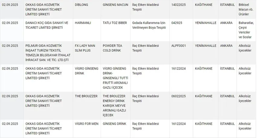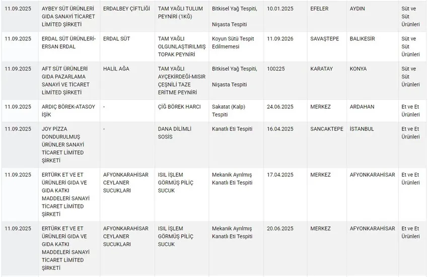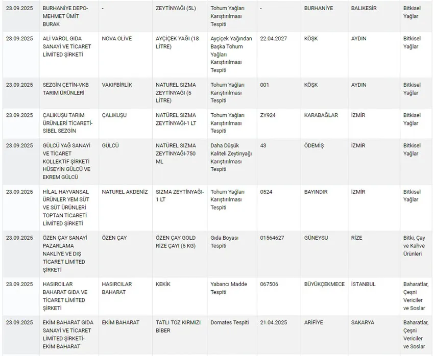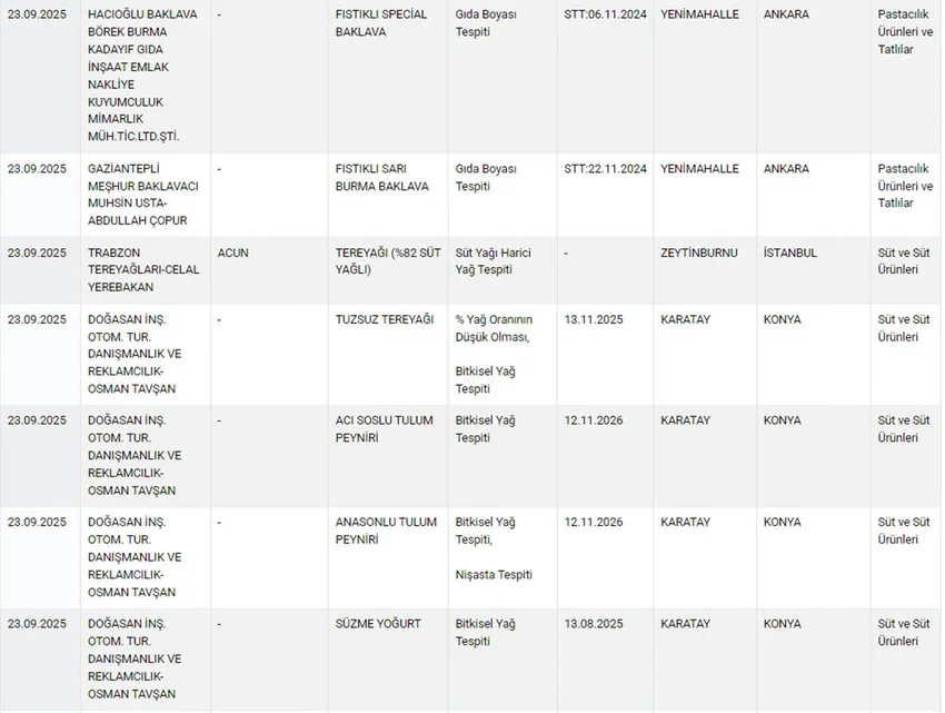 Bakanlığın 24 Eylül 2025 itibariyle güncellediği Eylül ayı Sağlığı Tehlikeye Düşürecek, Aynı değeri taşımayan madde eklenerek veya temel özelliği etkileyen içeriği eksik tutularak taklit ve tağşiş yapıldığı tespit edilen ürünler listesinde çikolatadan baklavaya, tereyağından peynire, yoğurttan simide, sucuktan kıymaya, köfteden zeytinyağına, çaydan kekiğe, kırmızı biberden bala, kadar yine pek çok üründe hile yapan firmalar tek tek ifşa edildi.