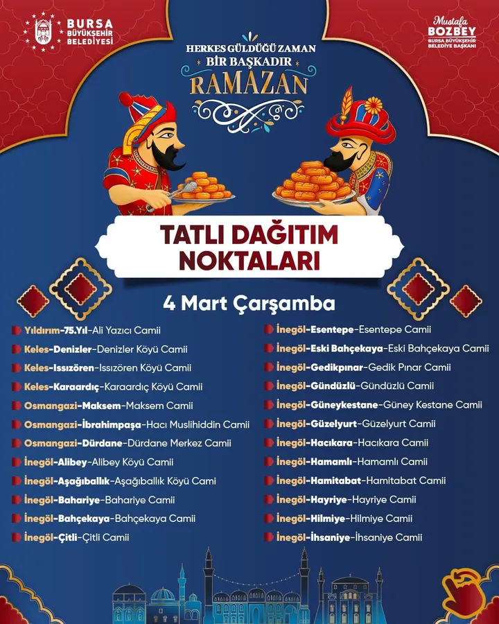Ramazan tatlı ikramı İnegöl, Bursa Büyükşehir Belediyesi Ramazan etkinlikleri, teravih sonrası tatlı dağıtımı ve CHP İnegöl açıklaması gibi başlıklar, etkinliğe dair merak edilen konular arasında yer alıyor.