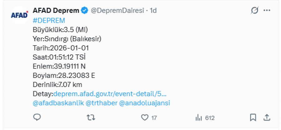 Yeni yıla depremle girildi. Afet ve Acil Durum Yönetimi Başkanlığı (AFAD) tarafından yapılan açıklamaya göre, Balıkesir’in Sındırgı ilçesinde saat 01.51’de 3,5 büyüklüğünde bir deprem kaydedildi.