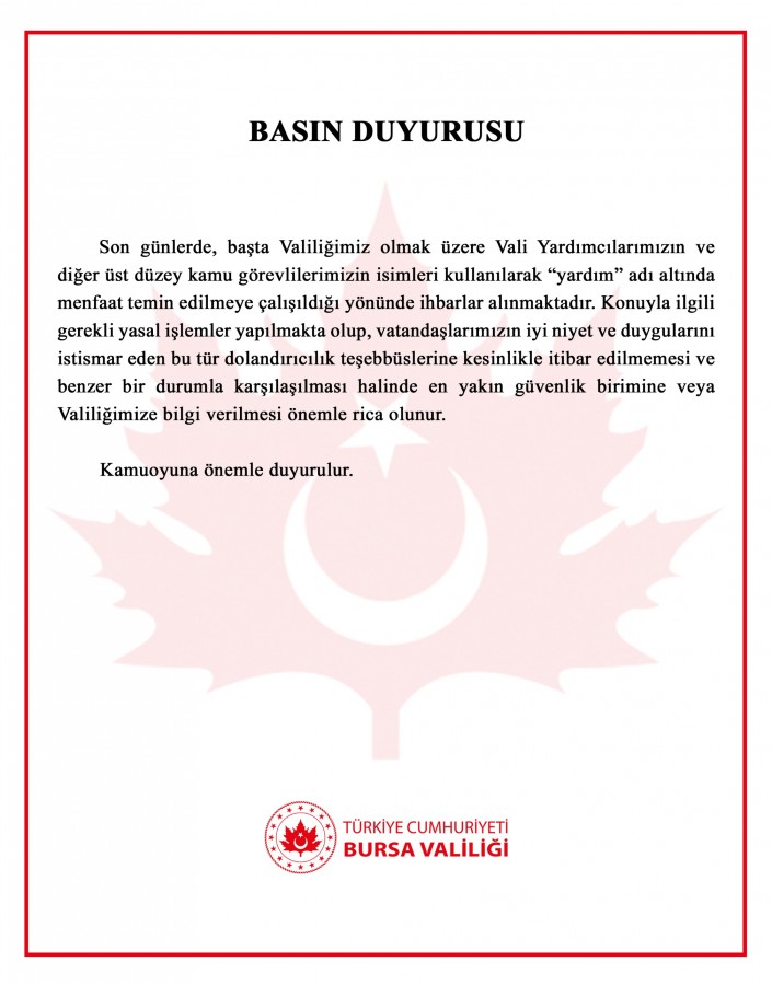 Bursa Valiliği, kamu görevlilerinin adı kullanılarak yapılan yardım taleplerine karşı vatandaşları uyardı: "İyi niyetinizi suistimal eden dolandırıcılara kesinlikle itibar etmeyin!"
