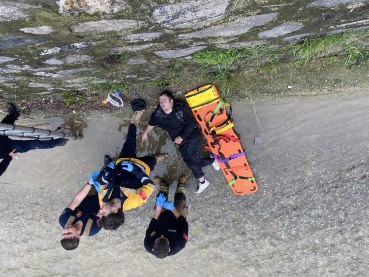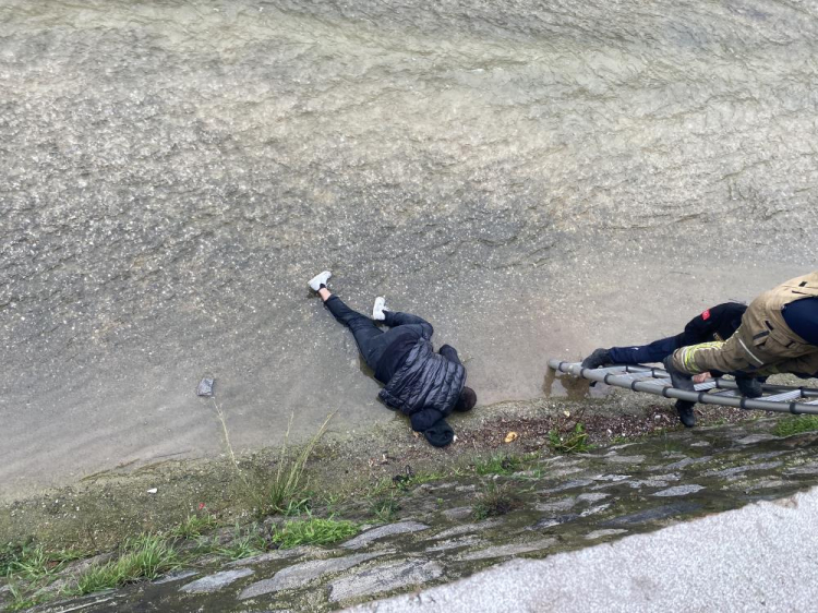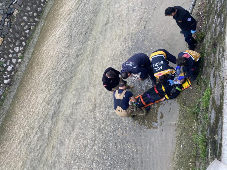 Mehmet Ali B., itfaiye ekipleri ve sağlık çalışanları tarafından dere içerisinden kontrollü şekilde çıkarıldı.