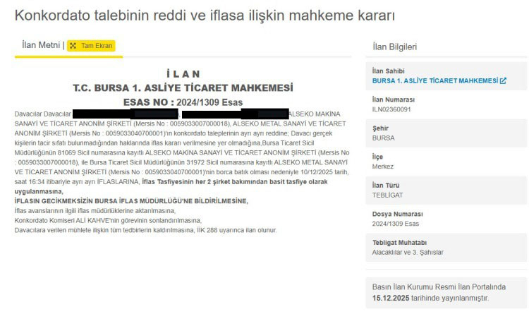 Bursa İflas Dairesi, Alseko Makina Sanayi ve Ticaret Anonim Şirketi'nin tasfiye sürecini başlattı.
