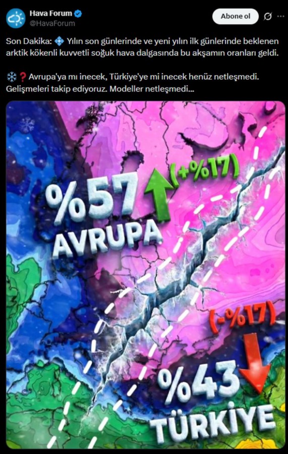 Öte yandan sosyal medya hesabı Hava Forum'dan dün akşam aktarılan bilgiye göre yıl sonu ve yılbaşında beklenen arktik kökenli soğuk hava dalgasının Türkiye'ye inme ihtimali son olarak %43 oranında gözüktü.
