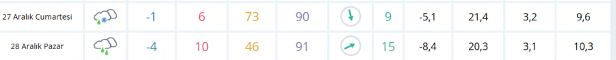 Meteoroloji Genel Müdürlüğü'nün (MGM) son tahminlerine göre ise 27 Aralık Cumartesi günü şehirde karla karışık yağmur bekleniyor. Sıcaklıkların birden düşmesi beklenirken akşam saatlerinde sıcaklığın -1 seviyelerine kadar ineceği bildiriliyor.