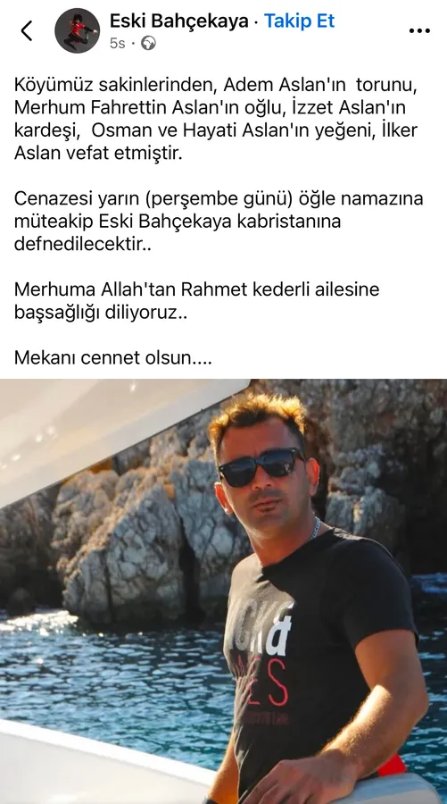 Edinilen bilgilere göre, köy sakinlerinden Adem Aslan’ın torunu, merhum Fahrettin Aslan’ın oğlu, İzzet Aslan’ın kardeşi, Osman ve Hayati Aslan’ın yeğeni olan İlker Aslan vefat etti.