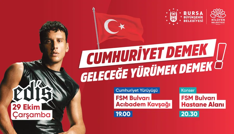 29 Ekim Cumhuriyet Bayramı etkinlikleri kapsamında Büyükşehir Belediyesi ve Nilüfer Belediyesi iş birliğiyle Fatih Sultan Mehmet Bulvarı’nda yapılacak olan ‘Cumhuriyet Yürüyüşü’ ile coşku doruğa çıkacak. Saat 19.00’da bir araya gelecek olan Cumhuriyet sevdalıları, ellerinde Türk Bayrakları ve Ata posterleriyle hep bir ağızdan şarkılar ve marşlar söyleyerek Cumhuriyet’i doyasıya yaşayacak. Saat 20.30’da Nilüfer Hastane Alanı'ndaki Edis konseriyle de Cumhuriyet Bayramı coşkusu perçinlenecek. Sevilen şarkılarını Bursalılar için seslendirecek olan Edis, muhteşem sahne şovuyla da vatandaşlara unutulmaz bir gece yaşatacak.