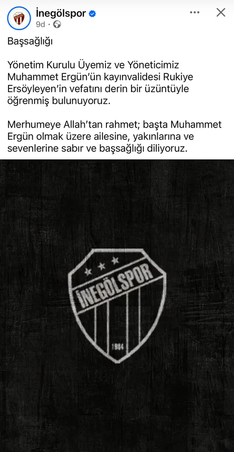 İnegöl Belediyesi geçmiş dönem meclis üyelerinden, Karadeniz Güvenspor’un eski başkanı ve İnegölspor Başkan Yardımcısı Muhammed Ergün’ün kayınvalidesi Rukiye Ersöyleyen hayatını kaybetti.