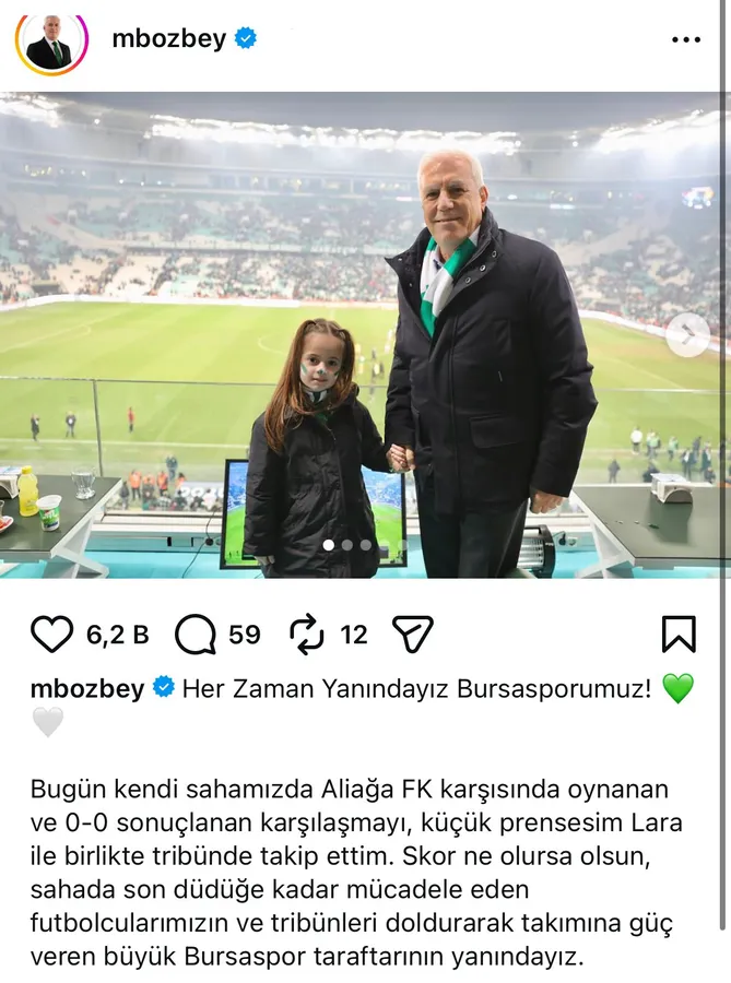 Bursa Büyükşehir Belediye Başkanı Mustafa Bozbey’in, Bursaspor’un Aliağa FK ile oynadığı karşılaşmayı tribünden takip etmesi ve “birliktelik” mesajı vermesi, Bursa spor camiasında memnuniyetle karşılandı.