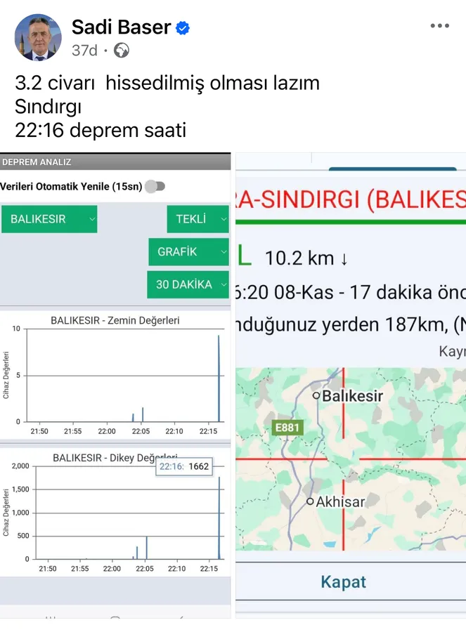 Paylaşımda, 22:16 anında cihaz verilerinde belirgin bir artış olduğu görülürken, harita üzerinde Balıkesir–Akhisar hattıişaretlendi. Başer, bu verilerin Sındırgı çevresindeki yer hareketliliğini işaret ettiğini belirtti.