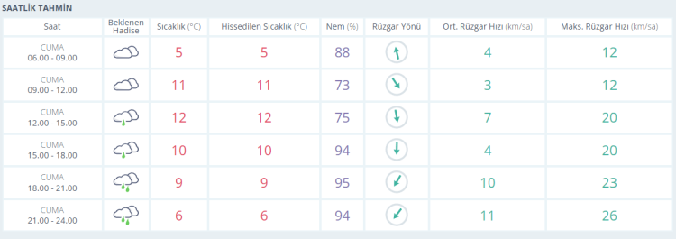 Gün içerisinde hava sıcaklığının öğle saatlerinde 12 dereceye kadar yükselmesi öngörülürken, akşam saatlerinde 9 dereceye, gece saatlerinde ise 6 derece civarına kadar düşeceği tahmin ediliyor.