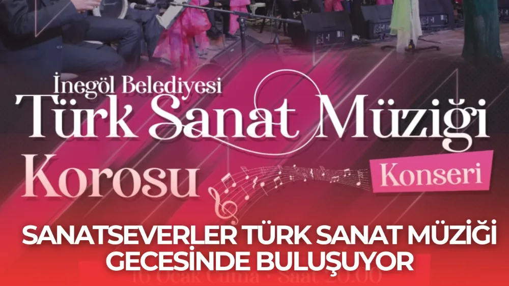 İnegöl Belediyesi Türk Sanat Müziği Korosu, Şef Diler Yalaza yönetiminde sahne alacak. Türk Sanat Müziği’nin hafızalara kazınan, seçkin eserlerinin seslendirileceği konser, 16 Ocak Cuma günü saat 20.00’de Beşinci Mevsim Kültür Sanat Merkezi’nde gerçekleştirilecek. Koro ve saz sanatçılarının güçlü performanslarıyla müzikseverlere unutulmaz bir akşam yaşatması hedefleniyor.
