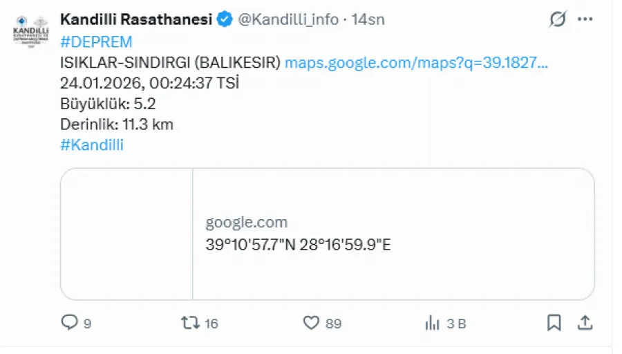 Gelen ilk bilgilere göre deprem Balıkesir Sındırgı'da gerçekleşti.
